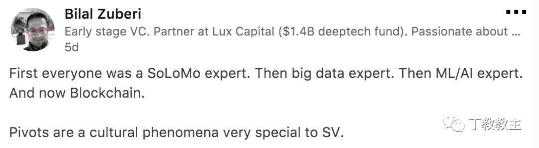 “First everyone was a SoLoMo expert. Then big data expert. Then ML/AI expert. And now Blockchain. Pivots are a cultural phenomena very special to SV. ”