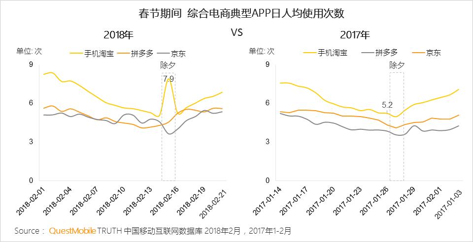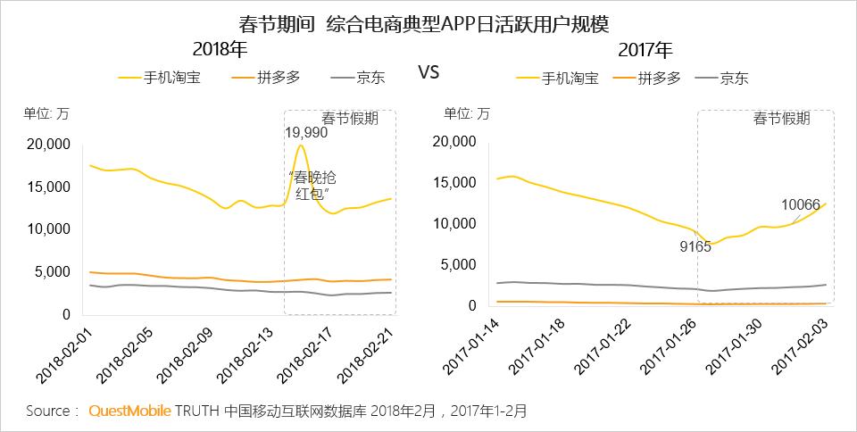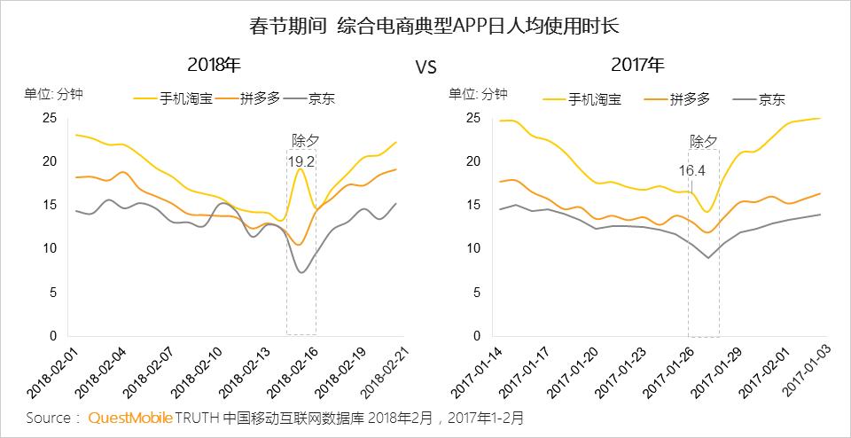 淘宝在春晚直播期间发放了大量的红包福袋和更多高价值特权商品;且多位明星参与的“春晚来电”视频互动、“淘宝亲情号”、“双屏互动”等活动大大提高了手机淘宝用户的粘性;得益于春节物流不打烊,拼多多、京东的用户粘性在除夕后迅速回升。