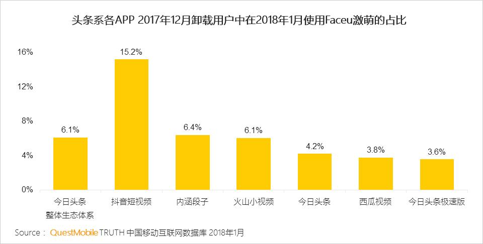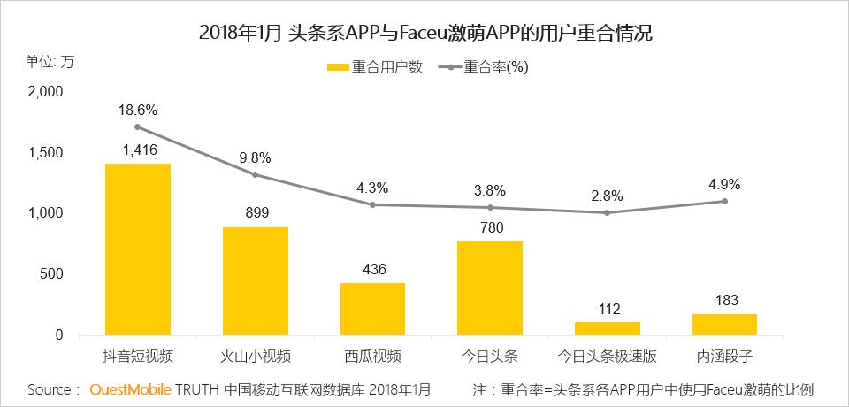 QuestMobile数据显示,在今日头条整体生态体系中,抖音短视频与Faceu激萌的重合度相对较高,相当于每6个抖音用户中就有1个在使用Faceu激萌APP。