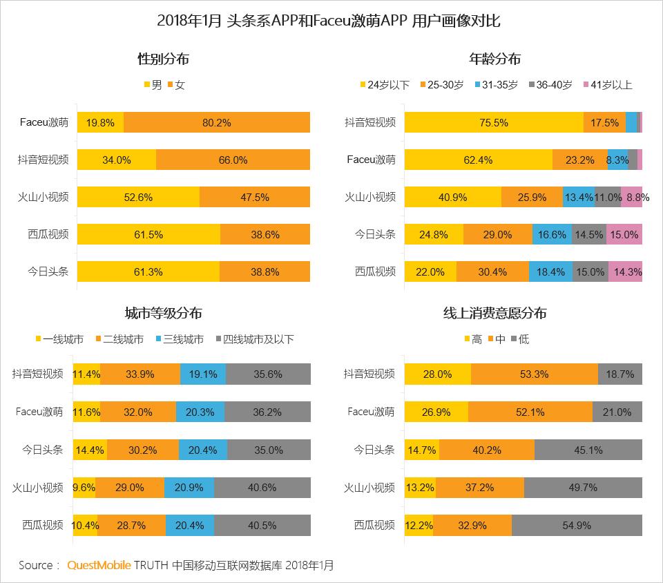 另一方面,Faceu激萌的用户女性较多,中高线上消费意愿占比近八成,为消费升级目标用户群体,潜在营销价值较大。