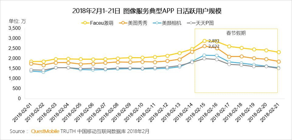 春节期间的“摄影大赛”带动图像服务类APP的爆发,从日活跃用户规模来看,典型APP在除夕和大年初一均出现一个小高潮。同时,大年初一今日头条宣布了对Faceu激萌的收购,力图增加后者与旗下的抖音、西瓜视频产生更多化学反应。并且,Faceu激萌代替火山小视频和抖音在各大卫视春晚的频繁“露脸”也进一步带动了用户增长。