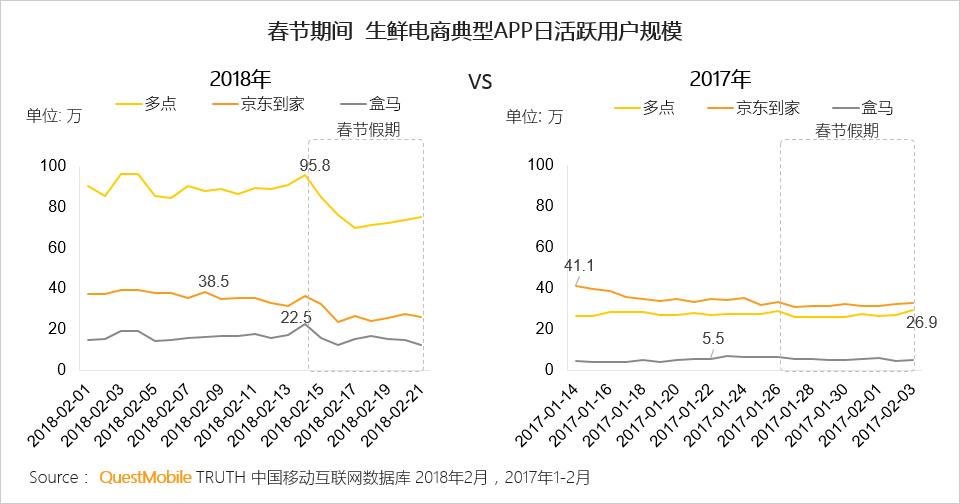 线上购买年货和生鲜商品的方式被更多人接受,生鲜电商发展迅速、春节前的年货购买潮达到高峰;与去年相比,多点、盒马发展迅猛,日活跃用户规模均实现翻番。