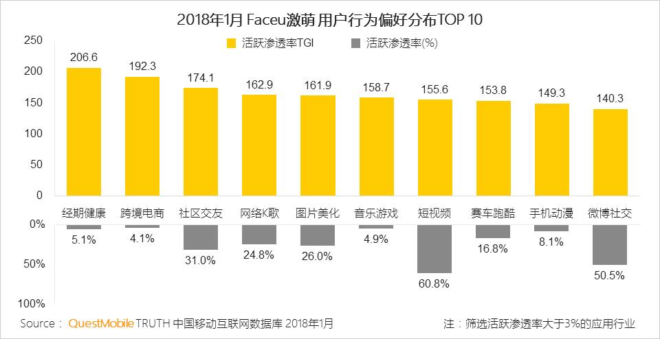 Faceu激萌用户用户行为偏好分布TOP 10中,泛娱乐类占了一半,可见其用户对泛娱乐类应用具有较强的偏好。其中,短视频应用受到Faceu激萌用户的青睐,超六成用户同时也是短视频用户。