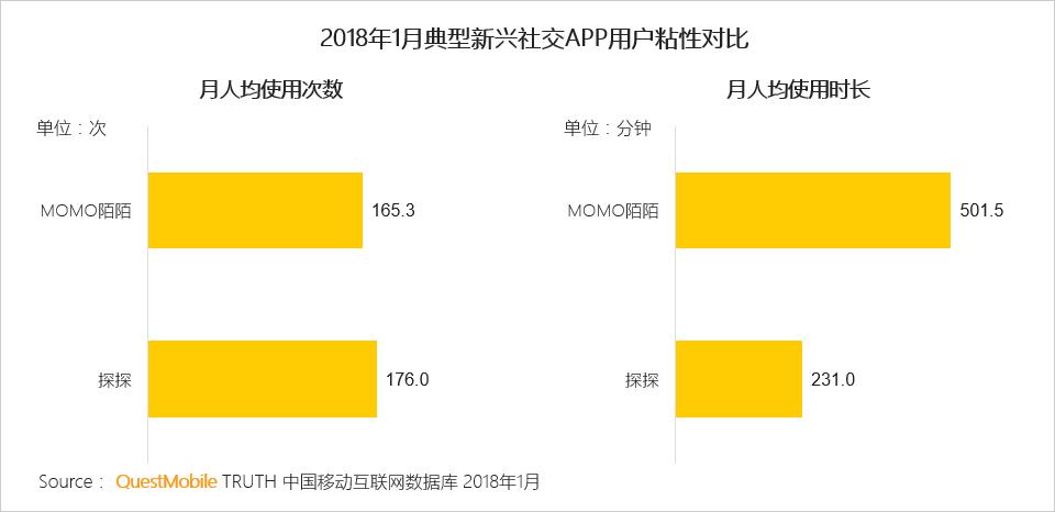 MOMO陌陌主打基于地理位置的开放式移动视频社交应用,是目前中国最大的泛社交泛娱乐平台,用户使用次数和时长均较高。探探则是基于照片的颜值社交,基于视频和图文的特性,探探的使用次数超过但时长低于MOMO陌陌的特点。