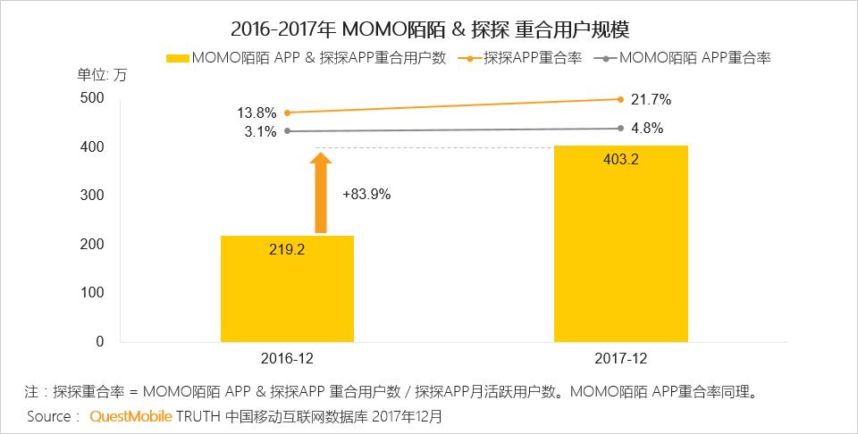 MOMO陌陌和探探同属于陌生人社交领域,在产品功能上具有一定的共生性。QuestMobile数据显示,MOMO陌陌APP和探探APP的重合用户规模不断扩大,2017年12月同比增长率达84%。