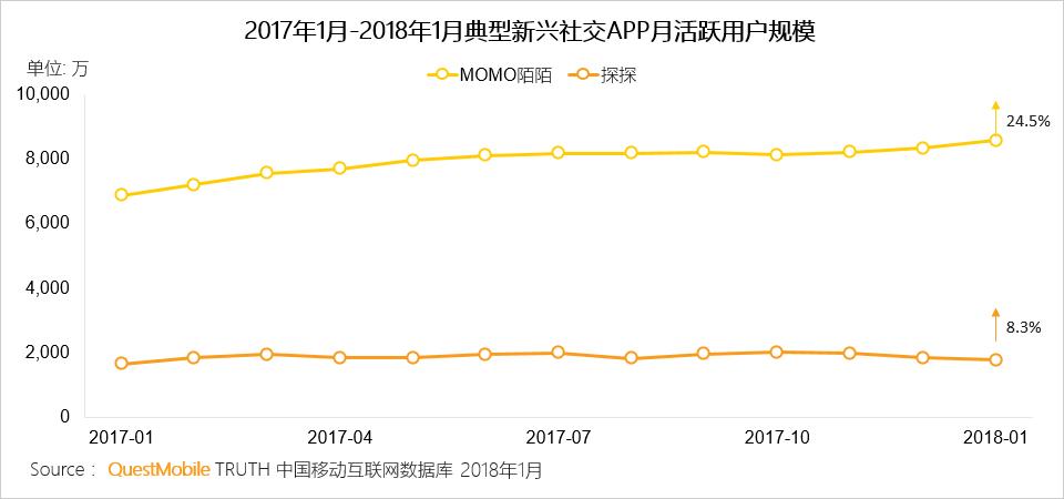 探探的用户规模仅为MOMO陌陌的1/4,2017年增量略低于MOMO陌陌,从用户规模上,对MOMO陌陌更大价值是业务模式的补充。