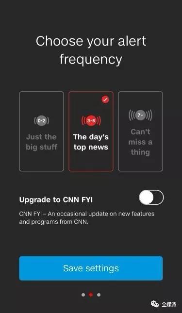 过于频繁的推送通知容易造成对用户日常生活的打扰,甚至招致反感。为此,CNN的客户端为用户提供推送频率的选择,希望让用户既不会被过多的推送所干扰,又不会错过所关注的信息。它将推送频次分为“0-2”、“3-6”、“7+”三个等级,并在每一等级下面清楚告知用户会推送的事件类型,有助于优化推送效果。
