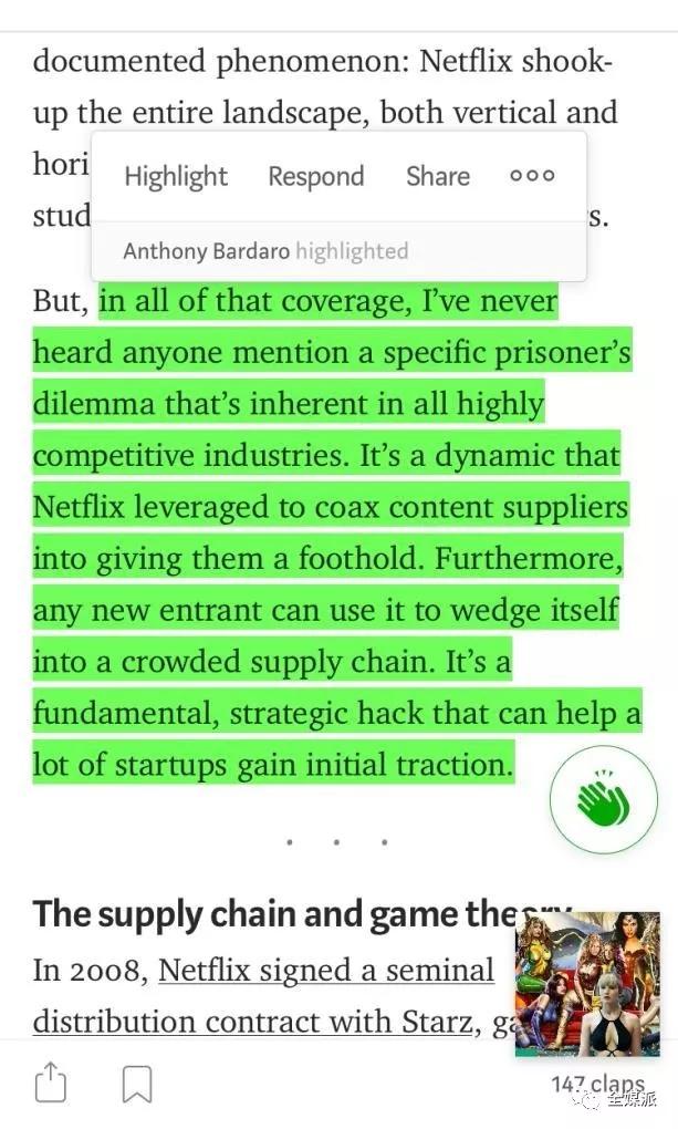 在Medium中,还可以对文章部分内容进行标记、回复或分享,也可看到其它用户的标记,提供了一个表达意见的互动舞台。