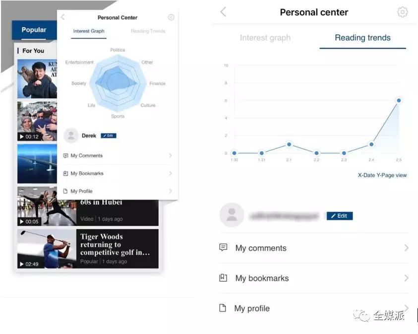 China Daily的“个人中心”里,根据用户的阅读记录形成用户阅读兴趣雷达图以及用户的阅读趋势折线图,以统计图的形式更加形象直观地记录用户的阅读习惯。APP可以根据记录向用户更为精准地推荐兴趣内容,提高用户“碎片时间”获取信息的效率,用户也可根据记录输出直观认识,以此制定阅读计划等等。