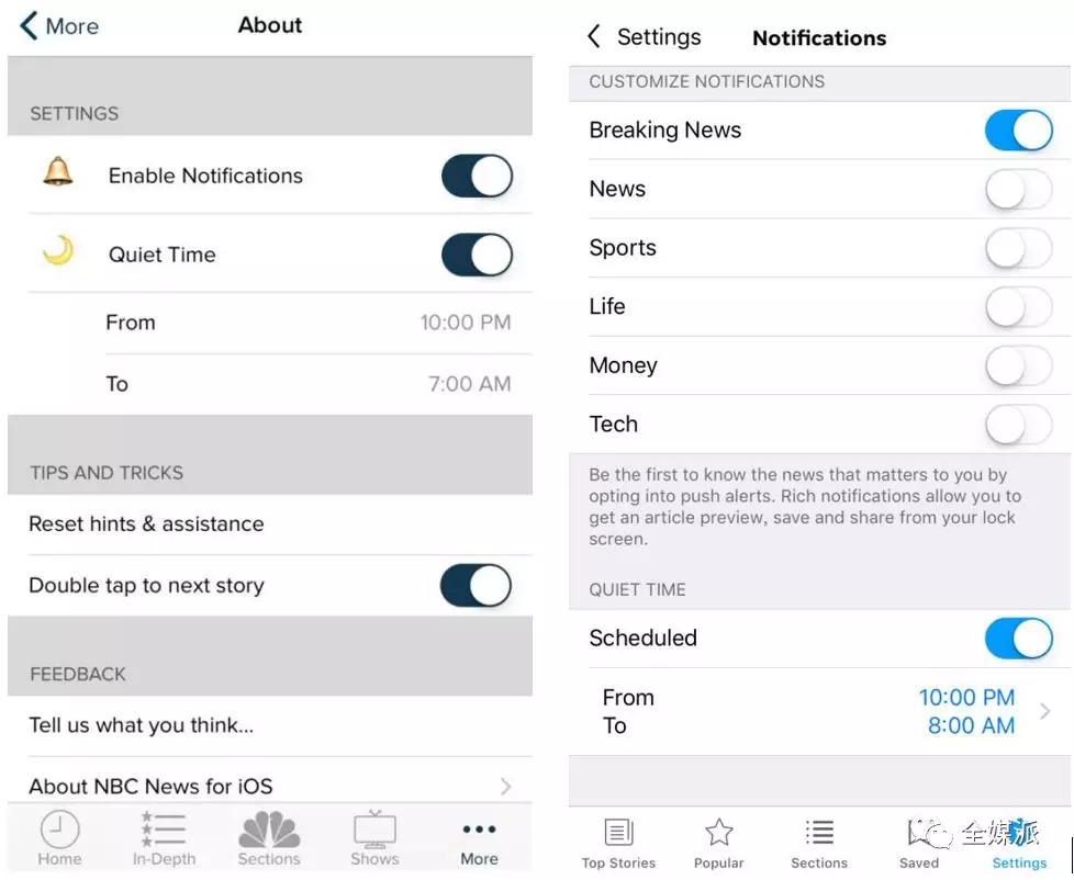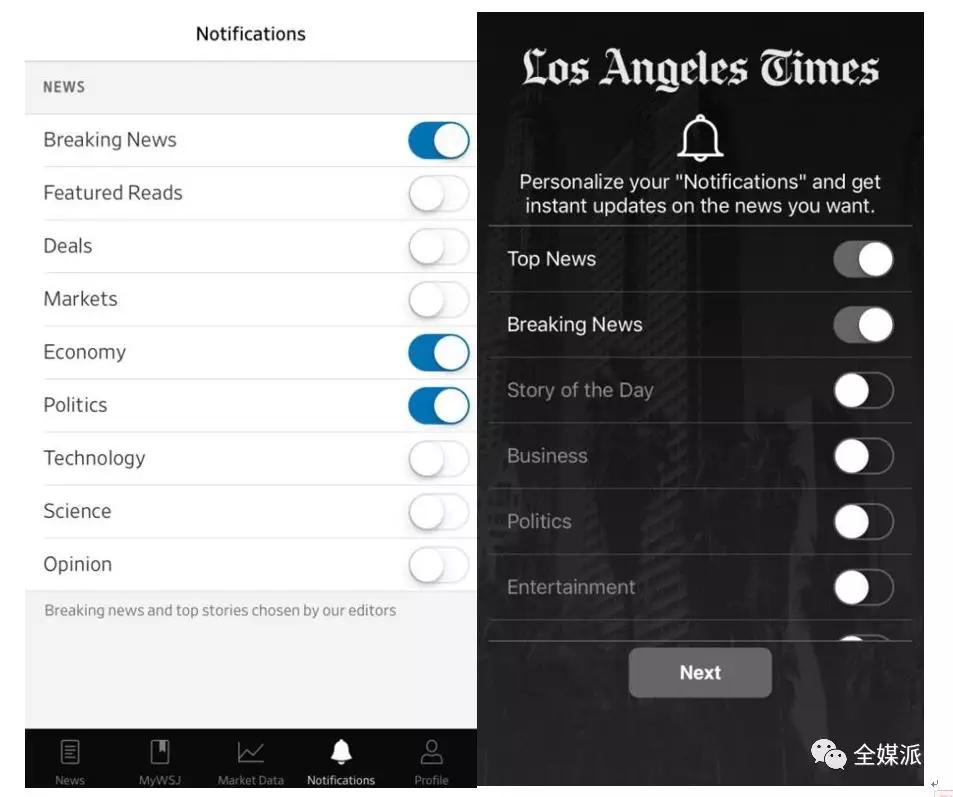 “个性化”是一个放之四海皆准的好思路,用户能自主选择订阅账户和垂直频道,当然也能自主选择push什么内容。目前,国外多家资讯APP已将通知分垂直类别开启,将主动权交还给用户,可根据自己的喜好来对通知的内容进行设置。贴合用户兴趣的推送更能唤起沉睡的用户,提高产品活跃度。