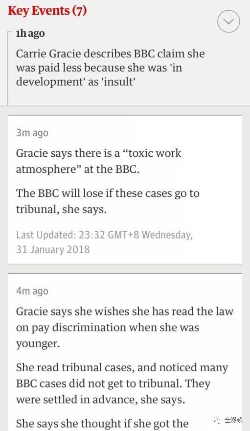 卫报APP中,对于有“live”标识的事件,会采用时间线的方式来对事件的最新进展做出说明。记者对事件情况进行即时更新,每个时间节点都用短短数行字概括总结,用户可以在短时间内掌握事件的发展脉络。