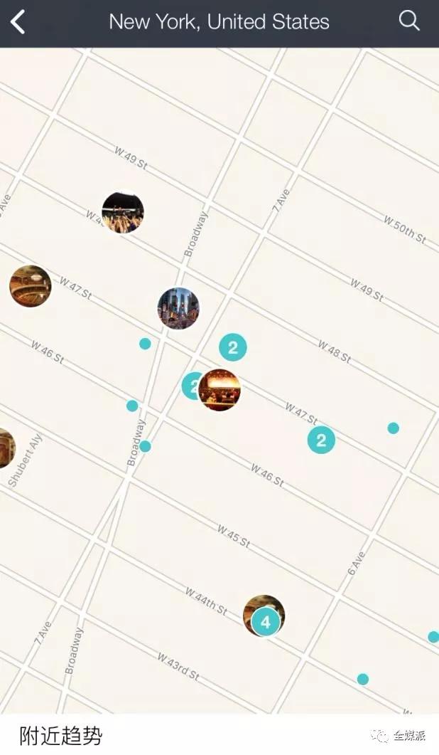 在Banjo中,能以“地理位置”来查找新闻,此时查找结果以地图的方式呈现,地图中圆圈上的数字代表此地用户发布了多少个帖子,而有图片的圆圈则是根据用户相似内容形成的热门新闻。