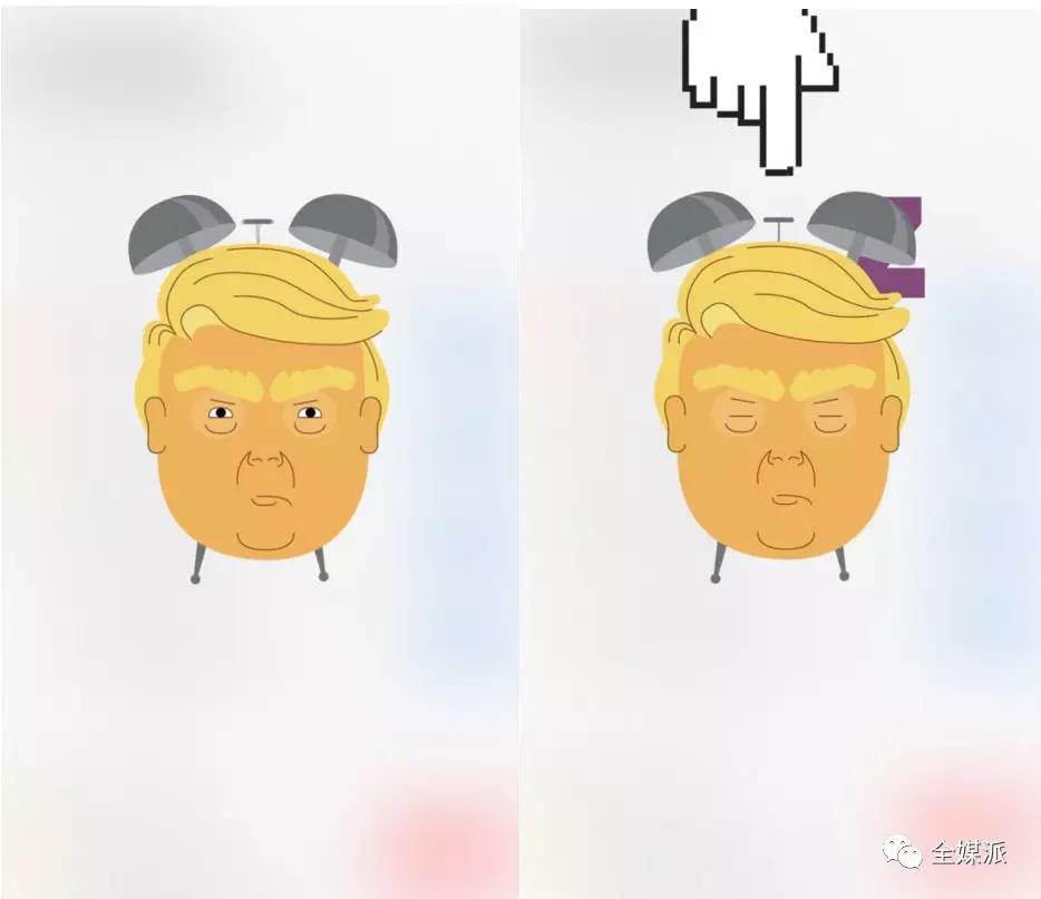 除此之外,Quartz在设置里还提供了“Trump snooze”的按钮,用户在点击后可在24小时内屏蔽关于特朗普的新闻。最有趣的是点击后出现的动画:一个川普样子的闹钟不断震动,紧接着一个手指将闹钟关闭,川普就打起了盹。