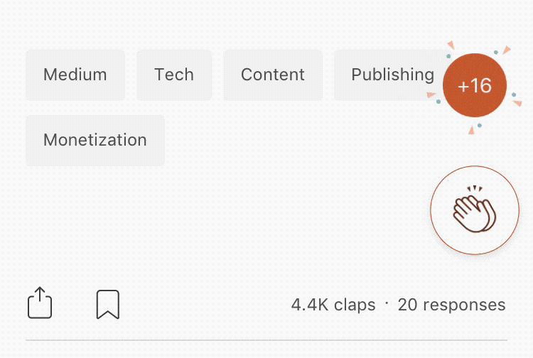 Medium则将我们习惯的“点赞”改为独特的“鼓掌”,如果用户喜欢某篇文章便可以长按鼓掌按钮来累加鼓掌次数。为了使用户行为更加真实有趣,每次点按时都会有动画效果。相比于传统的点赞,鼓掌能更生动地反映用户情感状态,小心鼓掌👏上瘾哦~
