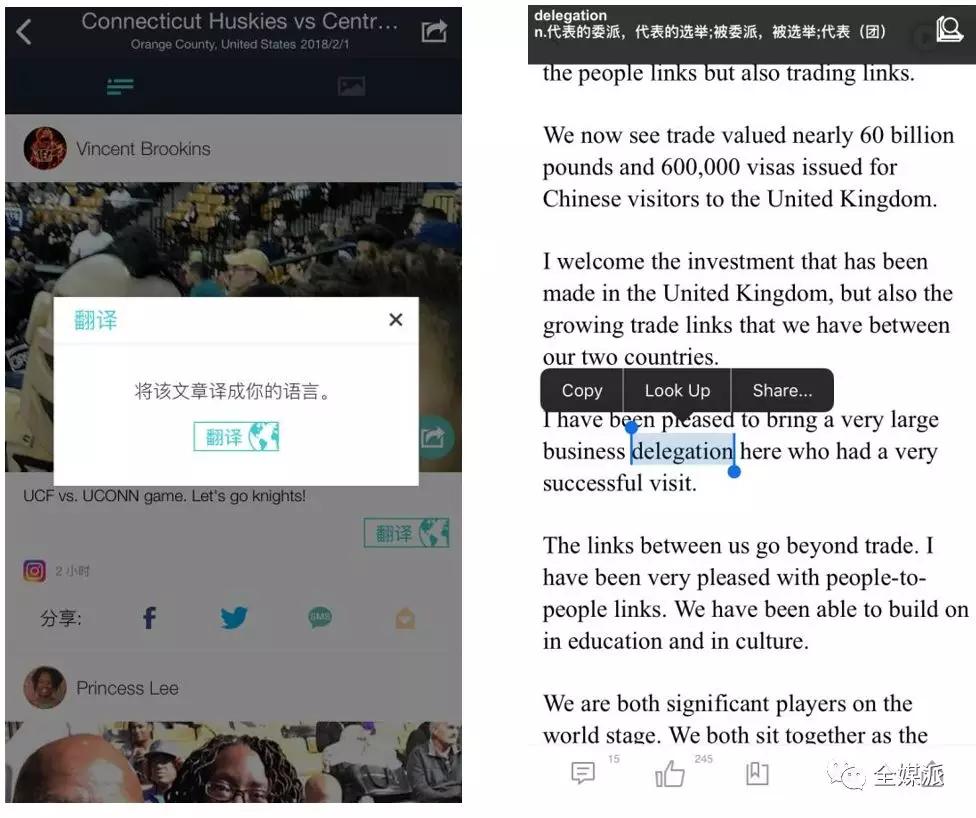 Banjo和China Daily 则为用户提供了贴心的翻译服务,Banjo会根据用户所在的地理位置将应用中的文字内容转换为用户所在地的语言,虽然翻译效果并不完美,但也起到了一定的参考作用;China Daily则提供的是“划词翻译”服务,当用户长按某个词时,页面上方会出现改词的中文释义,更方便用户阅读。