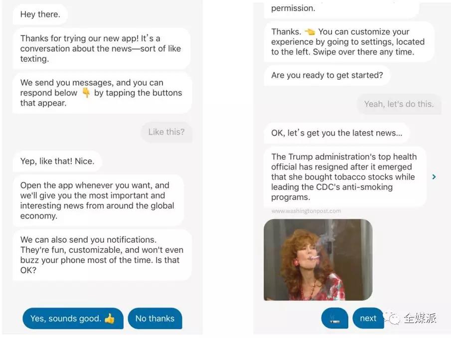 Quartz以聊天互动的形式来讲述新闻,通过简单的语句、聊天的口吻,来概括一条新闻的大致内容。Quartz还会为用户的回复提供不同的选择,有时还会灵活运用表情使对话更加真实有趣。