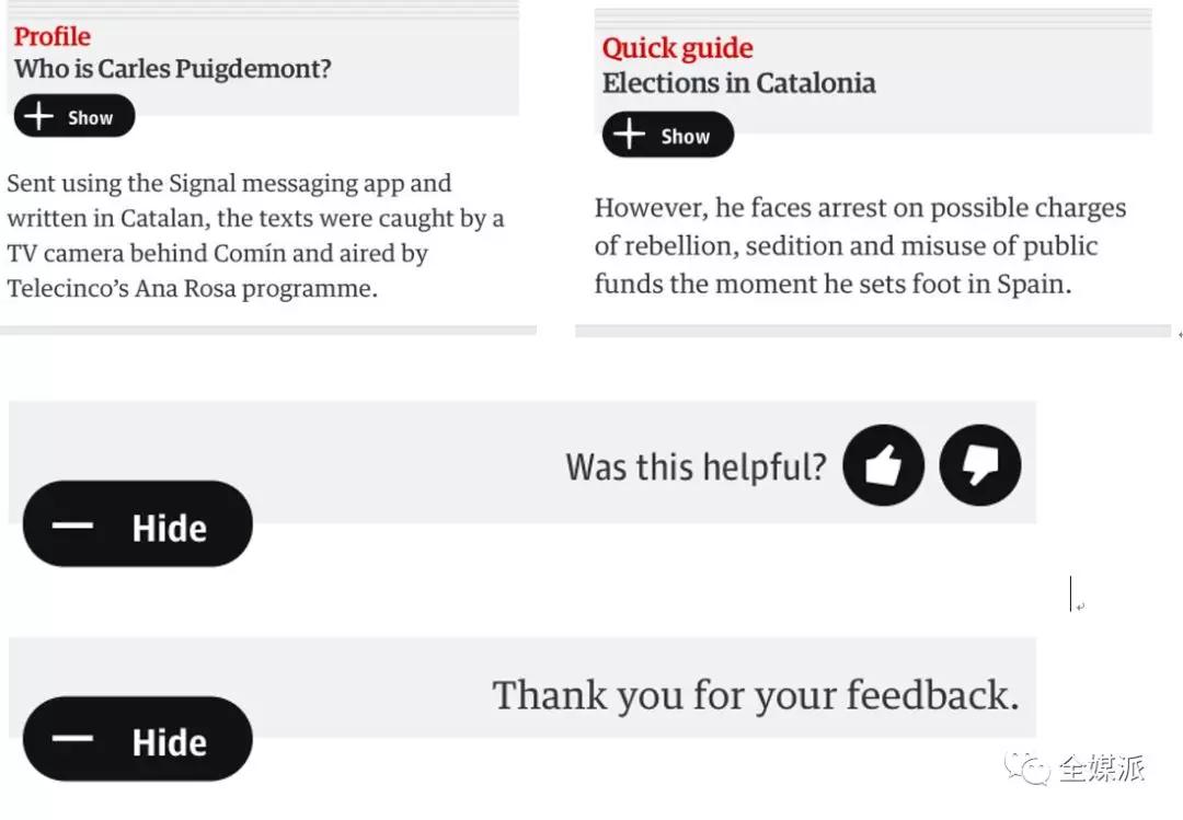 在《卫报》APP中,如果文章中出现对某些人物或事件背景的解释说明,或是一些相关问答,《卫报》会给出一个极简标题,如果读者有兴趣阅读,可点击“+show”的按钮展开;在阅读完成之后,还可以进行反馈,点击“有用”或“无用”的按钮来为卫报后续的改进提供数据支持。
