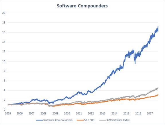 3、与标普 500 对比:如果我们拿出那些不断购买其他优秀软件业务的软件公司与标普 500 进行对比,那么结果会非常惊人,比标准普尔 500 强五倍。