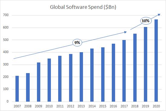 1、对软件的需求非常强劲且稳定。软件支出的增长已经持续了 10 年,增长率约为 9 %。 展望未来,Gartner 估计,软件行业预计增长率为 8-11 %,作为对比,美国经济增长率为 2-3 %,技术支出增长为 3-4 %。软件是一个很好产业。