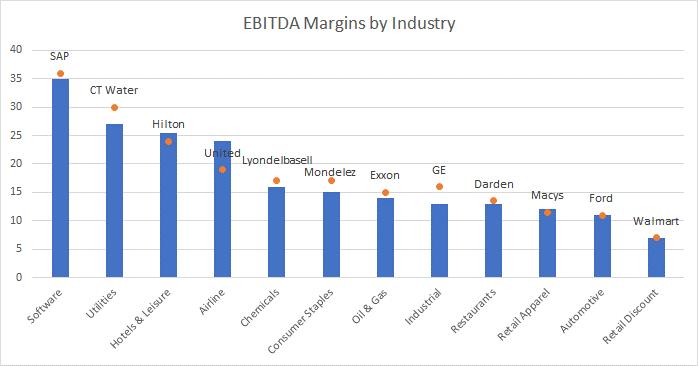 6、经营得当的软件公司是赚钱的。 事实上,软件是世界上最赚钱的行业之一。 以下是各个行业平均 EBITDA 利润率和典型企业。