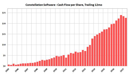 4、Constellation 的成功案例:伟大的软件业务是什么样的? Constellation software 是一家加拿大的公司,通过不断收购小软件公司,用这些软件公司产生的现金流再去收购其它小软件公司,不参与运营,取得了惊人的成绩: