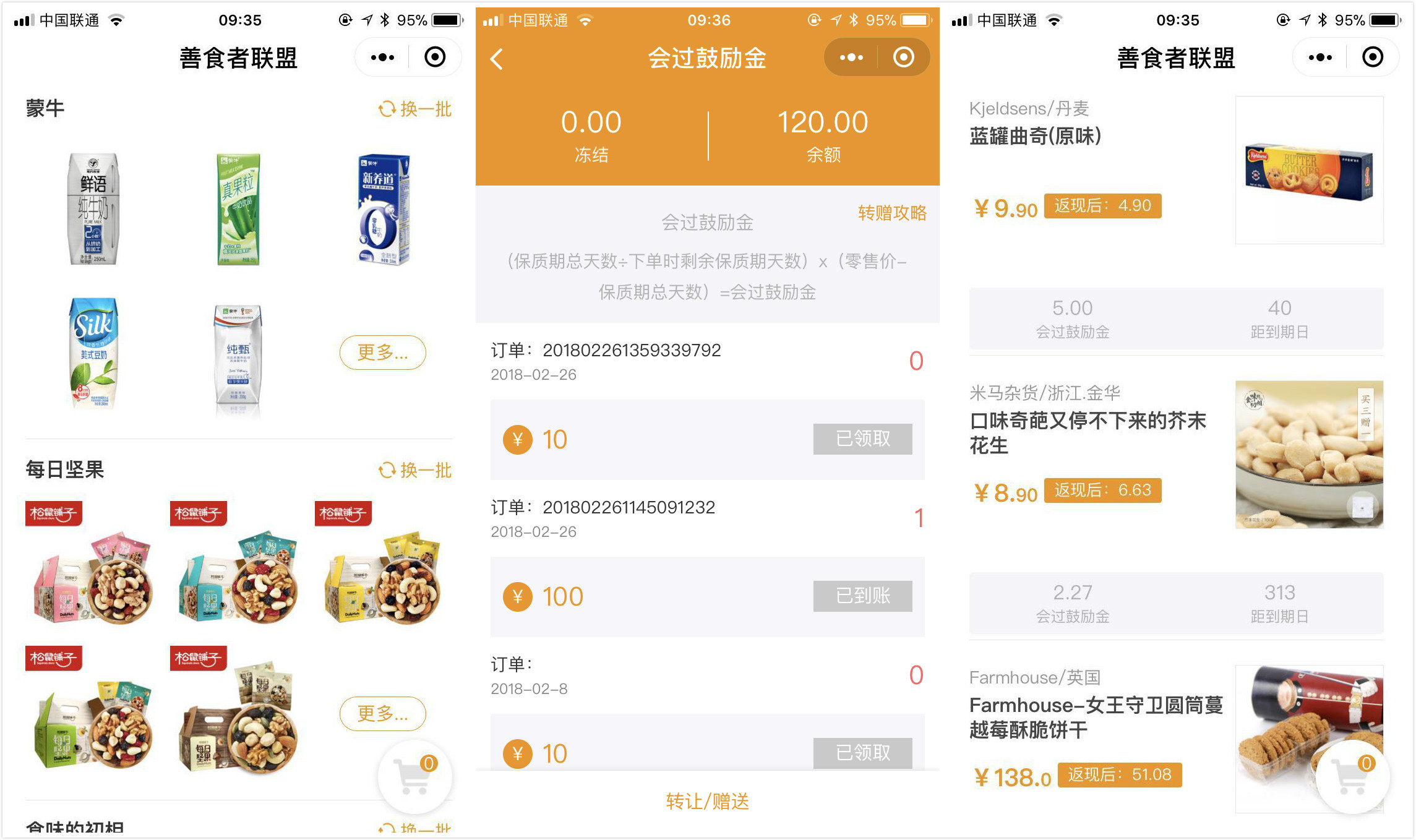 在盈利模式上,善食者联盟不打算抽取商品佣金,而是考虑在规模做大后,可能会:1)从会过鼓励金的线下使用场景(餐厅、分期购、自如等合作渠道)抽佣;2)向品牌商收取促销服务费;3)向C端收取会员费。