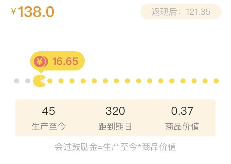 比如一款每日坚果原价 138 元,保质期 365 天,其每日价值就是 138/365=0.37 元;保质期还有 320 天,那么它在平台上的价值就是 0.37*320,相对应的,消费者购买此产品,能得到 0.37*(365-320)=16.65 的返利,平台把这种返利称为“会过鼓励金”,意思是你很会过日子。
