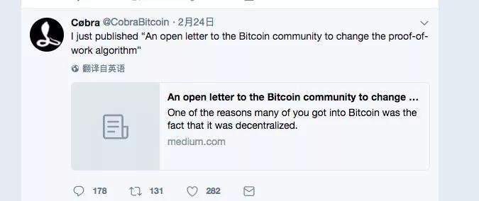 2月25日,bitcoin.org的负责人Cobra透过twitter发布了一封公开信,称比特币面临着中心化的威胁,因为算力统统集中到一个人手中。Cobra认为此人控制了绝大部分的哈希值 (及每秒运算的哈希值数量),因此需要为比特币设定一种新的poW算法,以此保持比特币的去中心化特征。