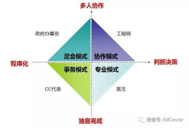 4、专业模式:对决策判断能力要求高,但协作程度低,能够独立完成,譬如医生、会计。