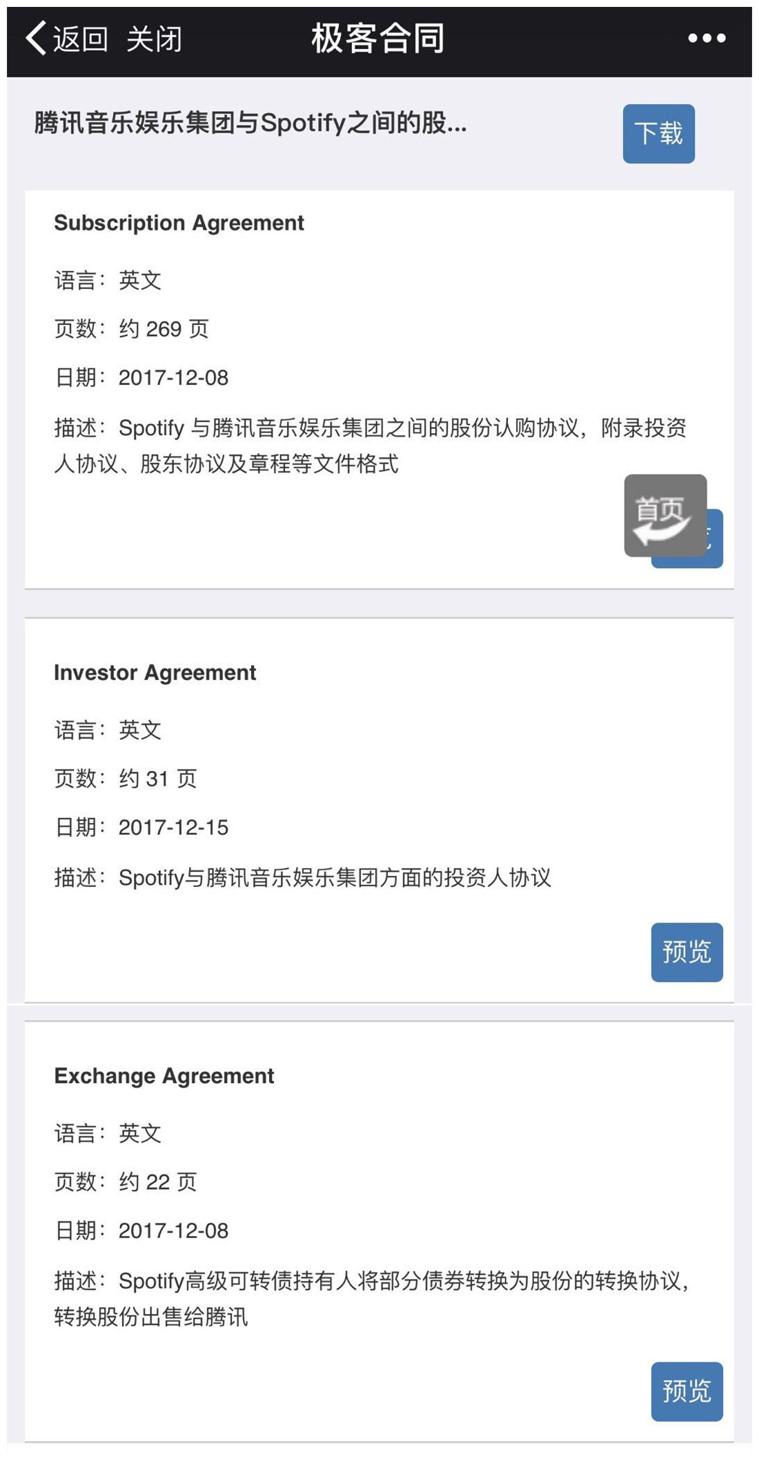 2017年12月,腾讯及旗下音乐娱乐集团与Spotify之间达成相互股权投资,包括两家数字音乐平台分别以现金购入对方的少数股权;此外,腾讯还从 Spotify 现有股东购入股份,这些股份由Spotify高级可转债持有人将债券转换为股份后转让给腾讯。