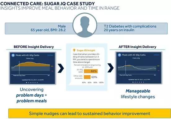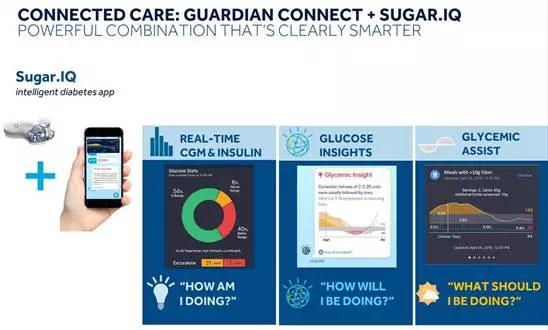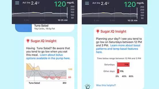 Sugar.IQ成为一个患者的虚拟助手,为其分析血糖波动,并提供会影响血糖波动的生活建议,预测提醒血糖趋势。
