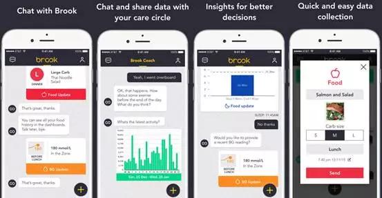 Brook主要是针对2型糖尿病患者的病情管理,用户可以通过即时通讯聊天方式来获取一对一的引导与建议。Brook主要在于日常饮食管理与生活习惯上,也包括用药情况,用户通过发消息来令应用记录数据。Brook可通过蓝牙连接其他血糖设备,支持Healthkit上已有设备。同时也具有社群性,可以通过应用与其他病友、家人朋友沟通,进入病友交流社区等。之所以使用聊天机器人智能对话系统模式,是为了让用户使用起来更方便,更直接,以激励用户长期坚持使用。