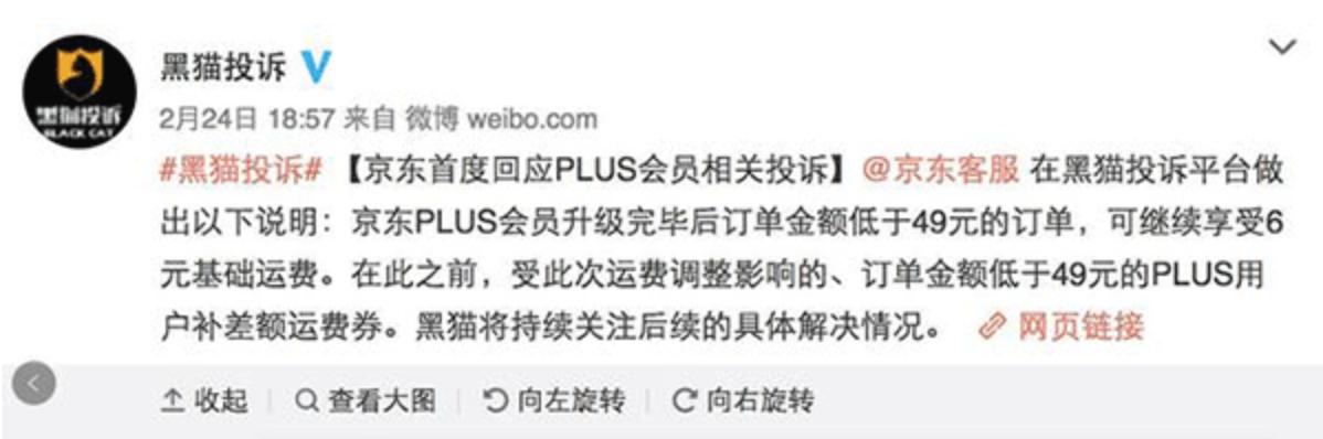 春节前夕京东发布新规定,购物不满49元将收取15元快递费,应用于所有用户。据IT之家网友反馈,目前PLUS会员49元以下订单已经恢复6元运费,但非PLUS会员仍然是15元。此前的运费调整规定直接影响了大部分PLUS会员的利益,导致PLUS会员送的免邮券形同虚设,因此遭到了大量PLUS会员的投诉,京东客服对投诉进行回应时表示,“为了更好地提升PLUS会员体验,目前PLUS会员正在运费权益优化升级,升级完毕后订单金额低于49元的订单,可以继续享受6元基础运费。在此之前,我们会为受此次运费调整影响的、订单金额低于49元的PLUS用户补差额运费券。”