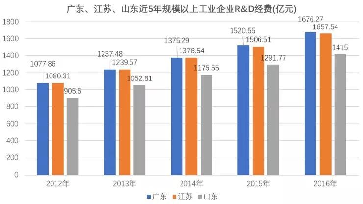 以上是近五年三省规模以上工业企业研发费用,广东和江苏差别很小,但山东和前两省的差距就比较大了。