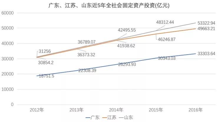 和广东、江苏比,山东在固定资产投资方面领先,这可以得出两个结论: