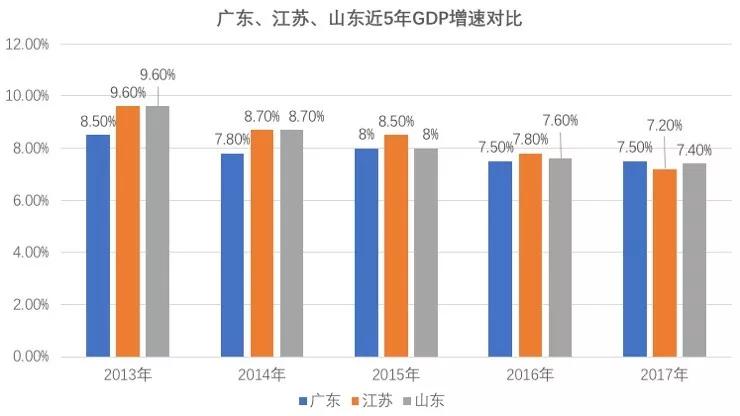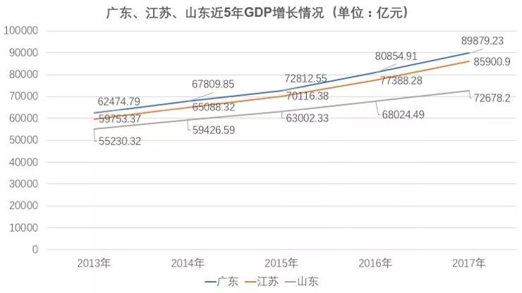 不过,从2015年开始,广东开始发力,渐渐缩小了与江苏、山东的差距,2017年,广东经济增速快于江苏和山东。
