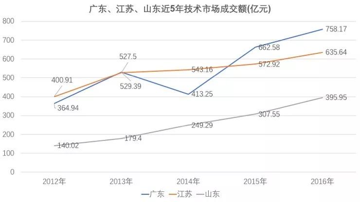 再来看看技术市场交易额,这个数据反应的是一个省市科技成果转化的能力,从数据来看,广东从2014年开始扶摇直上,一路拉开了与江苏、山东的距离。