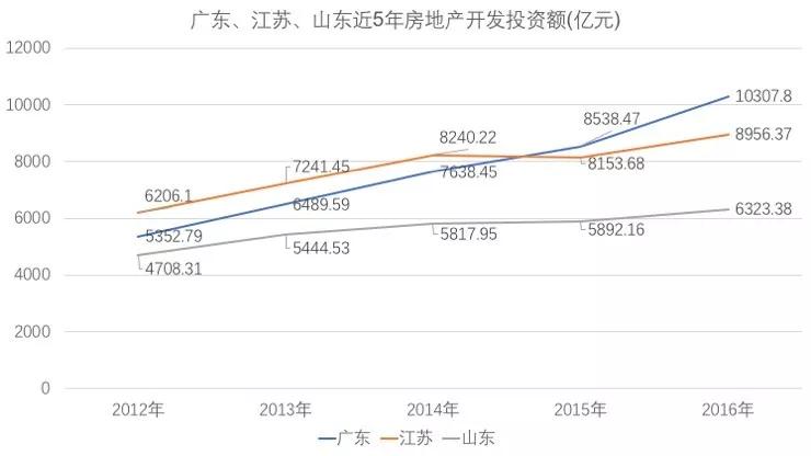上图是三省的房地产投资,可以看出,山东远远落后与广东、江苏,尤其是从2014年开始,增速非常低。