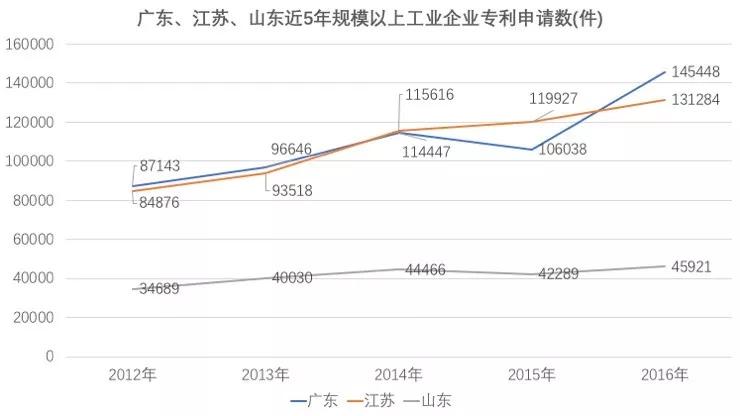 另外,从近五年三省规模以上工业企业专利申请数来看,山东也落后不少,2016年大约只有广东的三分之一。