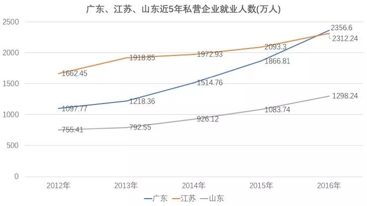 从上图可以看出,广东、江苏的民营企业就业人数远远多于山东,而且广东这几年增速很快,已经在2016年超过了江苏。