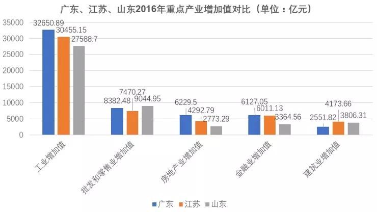 从上图可以看出,2016年,除了批发和零售业,山东工业、房地产、金融、建筑业增加值都小于广东或江苏。