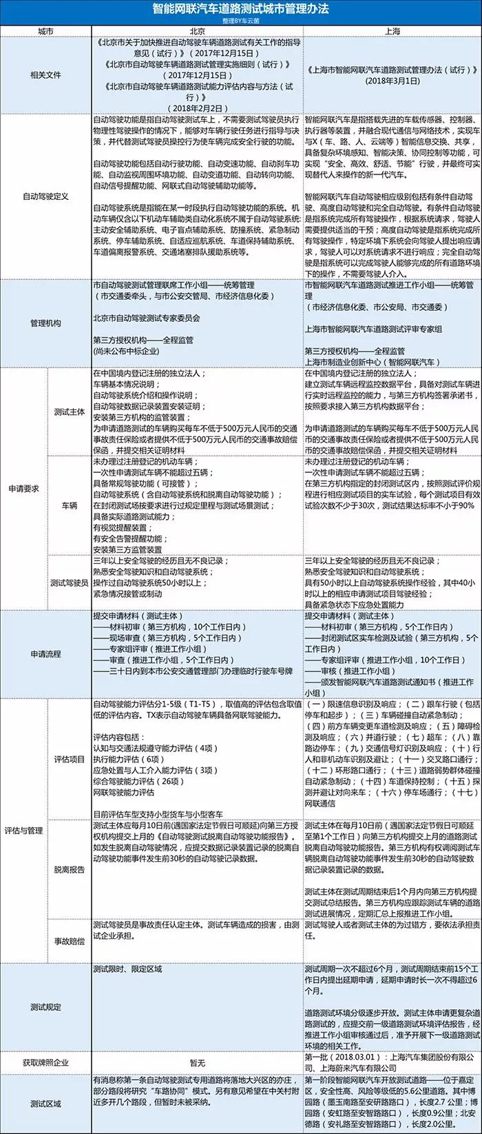 越来越多的城市开放自动驾驶道路测试,企业可供选择的机会变多了。我们把北京和上海的管理文件放在一起,划了一下重点。