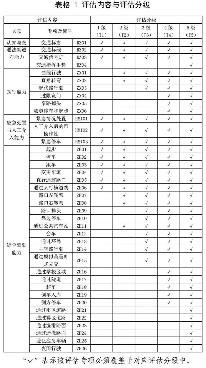 北京市申请自动驾驶道路测试的考核则比较严格,对评估车辆按自动驾驶能力分为了5级。最高级的评估内容包括6大项39小项。对于一些关键类项不合格的情况有一票否决权,直接给予不通过判定。