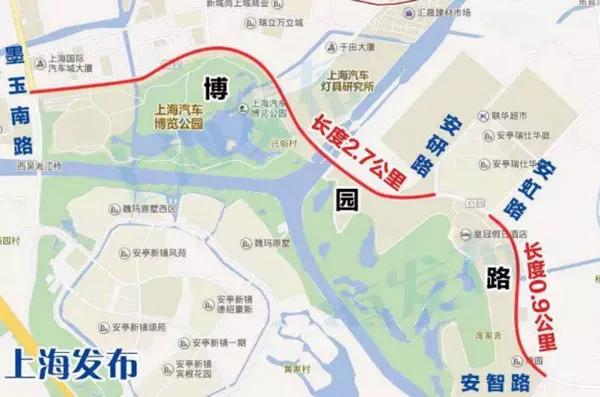 ▲上海市划定的自动驾驶道路测试路线。博园路(墨玉南路至安研路路口),长度2.7公里;博园路(安虹路至安智路路口),长度0.9公里;北安德路(安礼路至安智路路口),长度2.0公里。