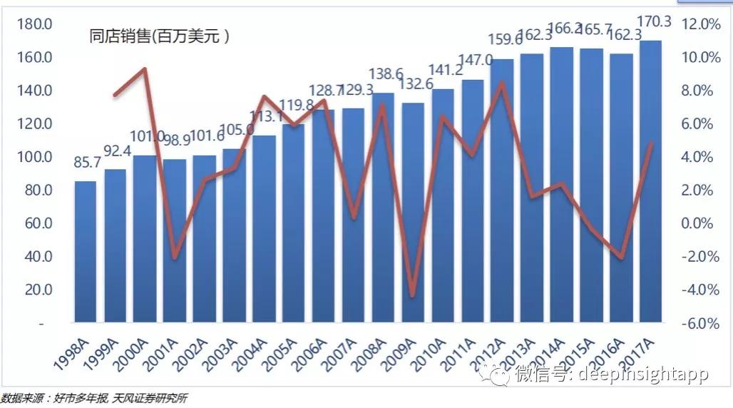 亚马逊拥有什么?无限货架,强大的物流,最低的流量获取能力。那么好市多就从差异化竞争。通过会员费,严选商品,独占性商品等角度来打造自己护城河。好市多并非像沃尔玛那样也去做电商,去和亚马逊在他最强的领域竞争。好市多反而是将自身优势做好,让用户愿意线下来到好市多购买商品。这也是为什么过去几年,好市多的单店销售额是增长的。截止2017年底,其单店销售额达到了1.7亿美元,是沃尔玛的四倍!