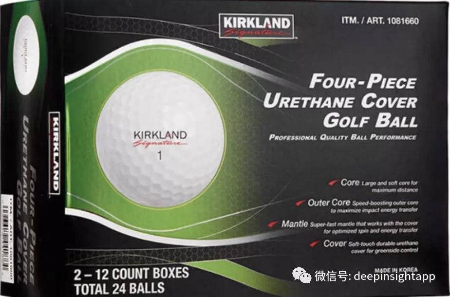 Kirkland自营产品优势在于超高的性价比。在不牺牲毛利率和质量的前提下,Kirkland自营商品很多时候比同类型的商品更便宜。背后的秘密主要是大规模采购能力。Costco本身变成了一个最大的渠道,任何Kirkland的品类都会受益于巨大的会员购买。而Kirkland在产品包装上会通过大包装模式,让产品的单价更加便宜。比如我们看到下图的Kirkland高尔夫球产品。