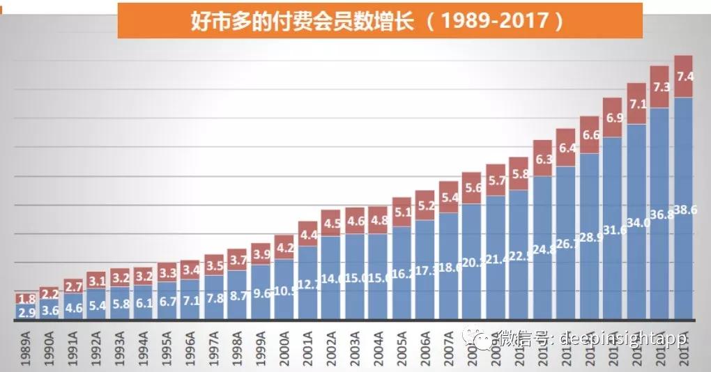 下图是王晨做的过去20年好市多付费会员数增长。截止2017年底,美国和加拿大区域会员续费率达到了90%,全球范围的会员续费率达到了87%。如此之高的续费率是一个结构,背后的原因无外乎来自极致用户体验。极致的用户体验无外乎方便,便宜,产品质量好。极致的用户体验,带来了付费用户的强烈价值感。