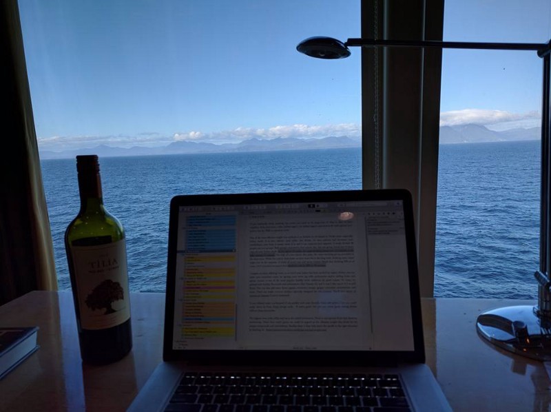 上一周我因工作去阿拉斯加乘船游览,并为自己接下来的一本书撰写了很多内容。这幅图也许是现代写作职业的缩影:美酒、笔记本电脑以及大海......你需要的就这么多!