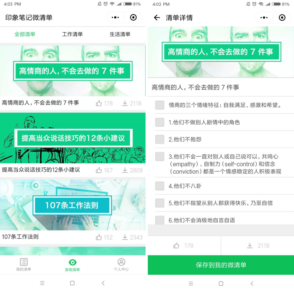 如果你是初次制定清单,可以通过「发现清单」来学习别人的高效率清单。当然,如果你认为某个清单对你很有帮助,那你可以把它添加到「我的清单」中,方便你使用。