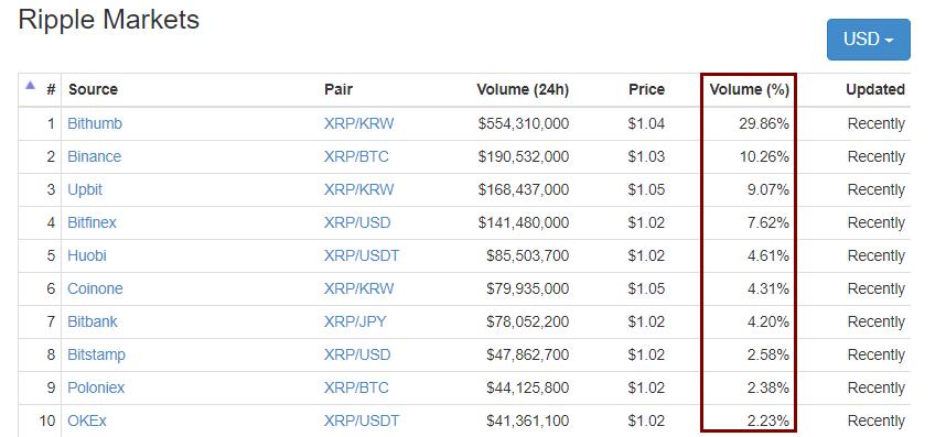从Coinmarketcap数据看,这轮瑞波币大涨韩国投资者的确功不可没:最近24小时韩国瑞波币交易量激增,交易量前十的交易所中,有四个位于亚洲。截至发文,韩国交易所Bithumb的XRP日内交易量增长约30%。